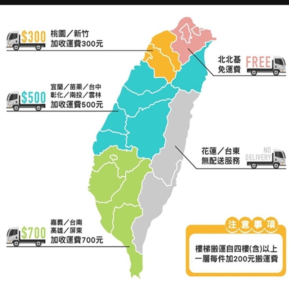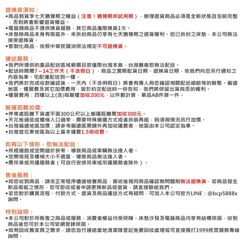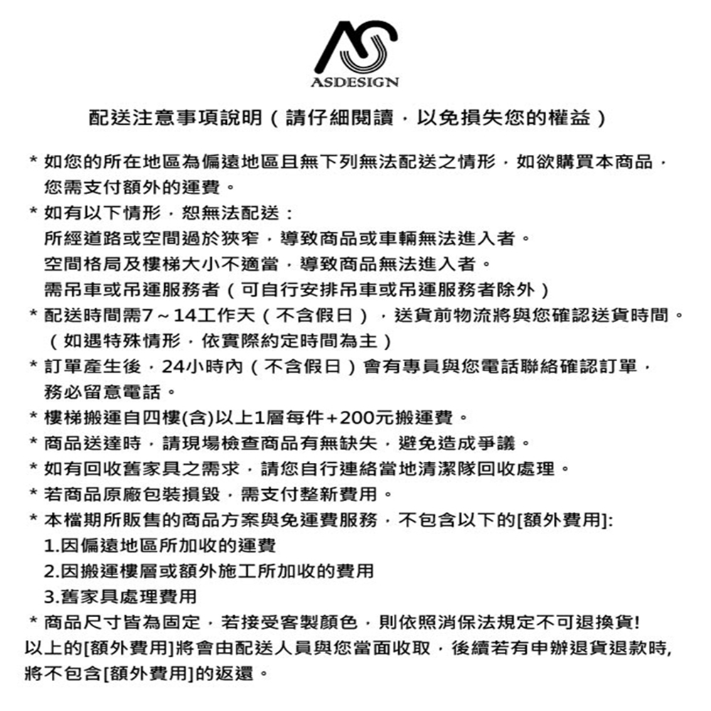 - 配送時間需7~14工作天(不含假日),商品之實際配貨日期、退換貨日期,依我們向您另行通知之內容為準。宅配僅配送到一樓。